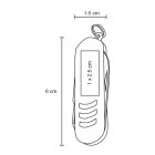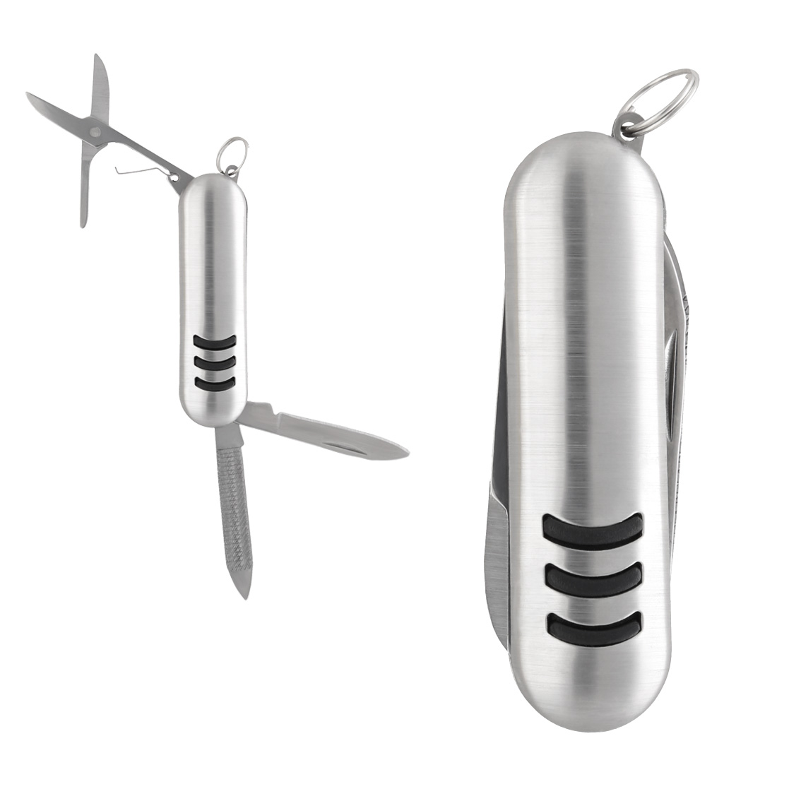 Mini navaja metálica con 3 funciones que contiene: tijeras y doble navaja con lima, cuenta con arillo para usar como llavero.