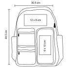 Mochila con compartimento principal con porta laptop de 17″, cuatro compartimentos frontales de diferentes tamaños con cierre, dos bolsas laterales, respaldo y tirantes acolchados, asi como asa superior.