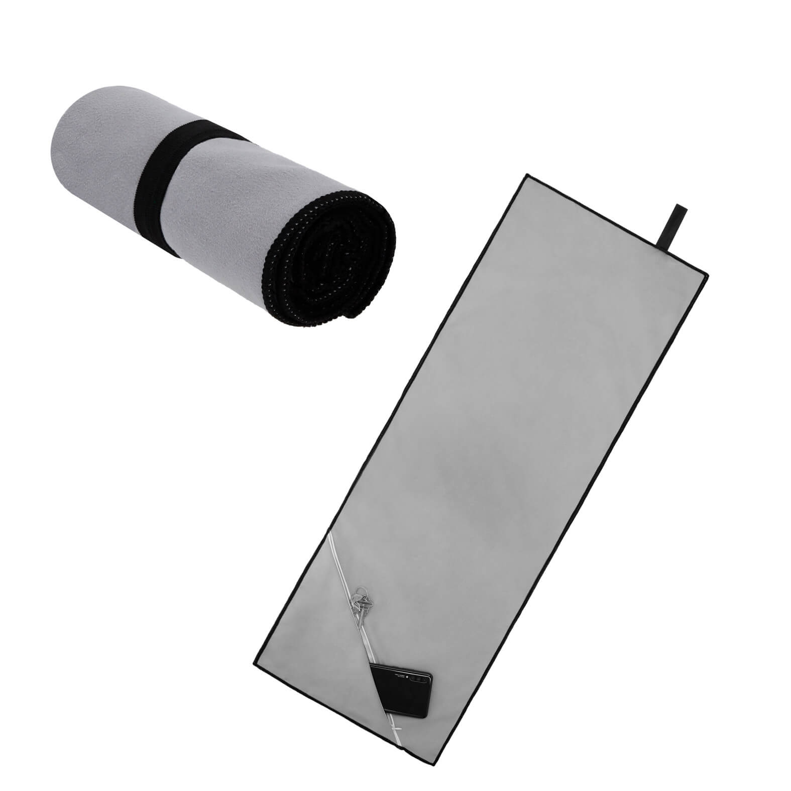 Toalla deportiva de poliéster con compartimento de cierre en la esquina y resorte para enrollar.