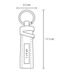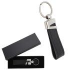 Llavero metálico con correa de curpiel y orillas bordadas.