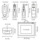 Set de viaje con 8 accesorios: 1 atomizador, 1 bote con dispensador, 2 botes con tapa Disc Top, 1 bote, 1 recipiente para almacenamiento, 1 mini embudo y 1 palita. Incluye estuche.