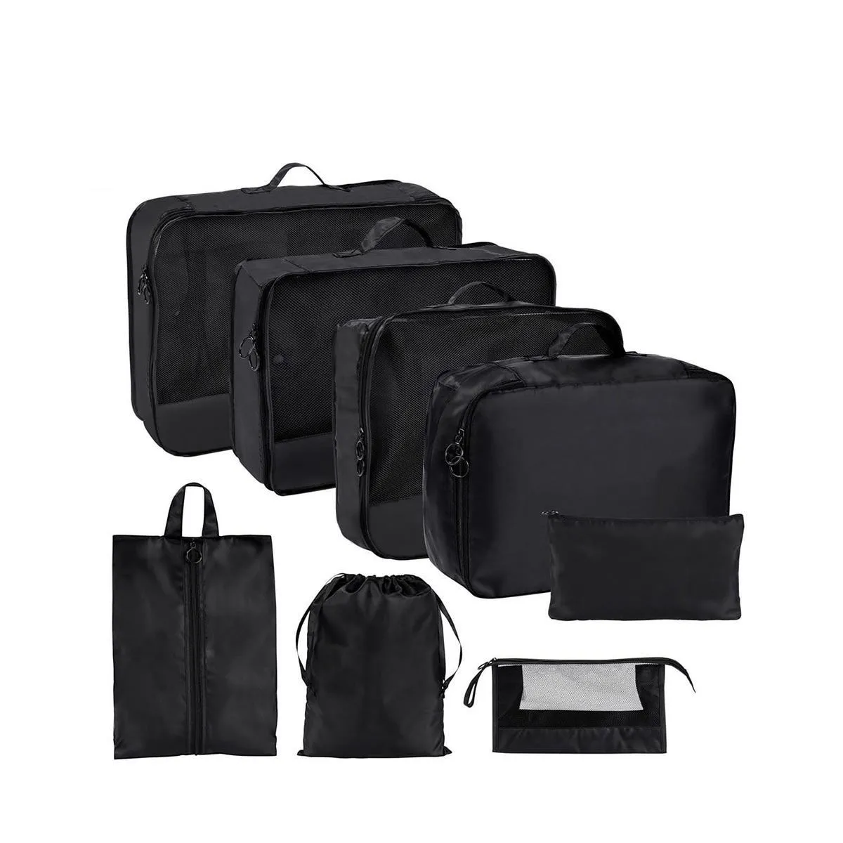 Organizador de maleta 8 en 1. Incluye 3 bolsas para ropa con malla para una mejor ventilación, la bolsa grande y mediana incluyen dos sujetadores interiores con broche de plástico para organizar tus artículos, además de broches de plástico que te permiten unir las diferentes piezas, 1 bolsa con cierre y asa para ropa interior, 1 bolsa con cierre para calzado, 1 bolsa con cierre tipo jareta, 1 bolsa chica con cierre y 1 bolsa cosmetiquera con malla.