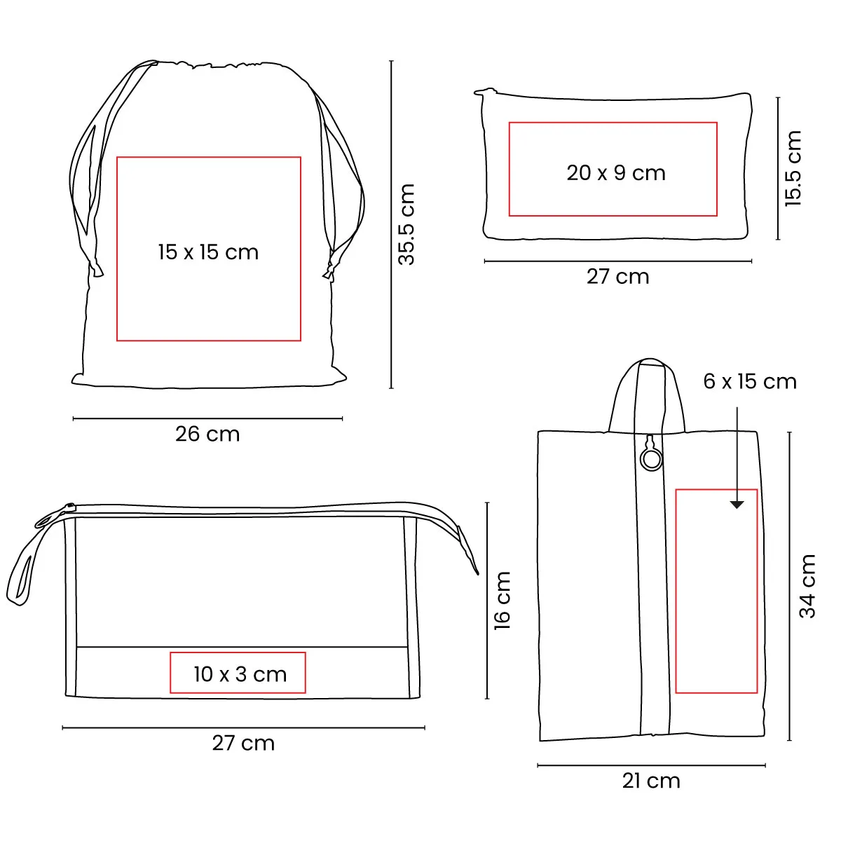 Área de impresión: 20×5 cm cm Bolsa grande / 20×4 cm Bolsa mediana / 20×3 cm Bolsa chica / 15×13 cm Bolsa para ropa interior / 6×15 cm Bolsa para calzado / 15×15 cm Bolsa-morral / 20×9 cm Bolsa con cierre / 10×3 cm Bolsa cosmetiquera