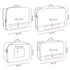 Medidas: 41x31x11 cm Bolsa grande / 33x28x11 cm Bolsa mediana / 33x 23×11 cm Bolsa chica / 30x22x11 cm Bolsa para ropa interior / 21x34x11 cm Bolsa para calzado / 26×35.5 cm Bolsa-morral / 27×15.5 cm Bolsa con cierre / 27x16x11 cm Bolsa cosmetiquera