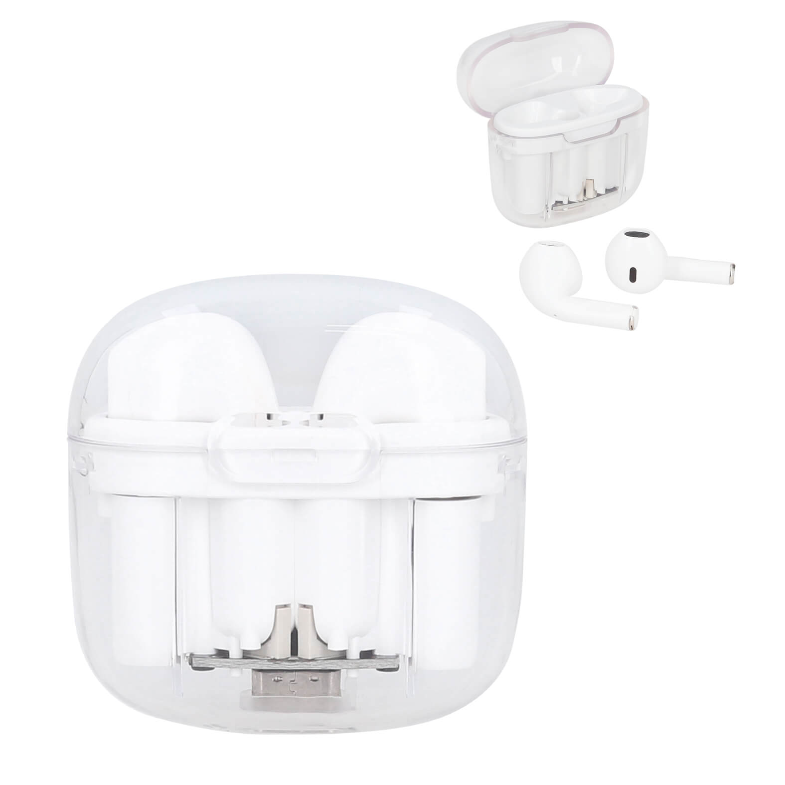 Audífonos inalámbricos con estuche transparente, batería recargable y mecanismo touch. Incluye cable de carga tipo C.