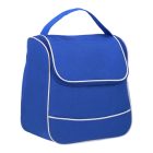 Lonchera de poliéster con interior impermeable plastificado, cierre, asa y un compartimento externo al frente.