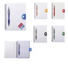 Libreta de 80 hojas, cubierta de plástico, espiral metálico y bolígrafo.