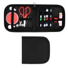 Set de costura de poliéster con cierre que incluye: 2 ensartadores de hilo, estuche con 10 agujas, 3 botones, 1 seguro, tijeras, 2 alfileres, 12 carretes de hilo de colores, dedal y cinta métrica.