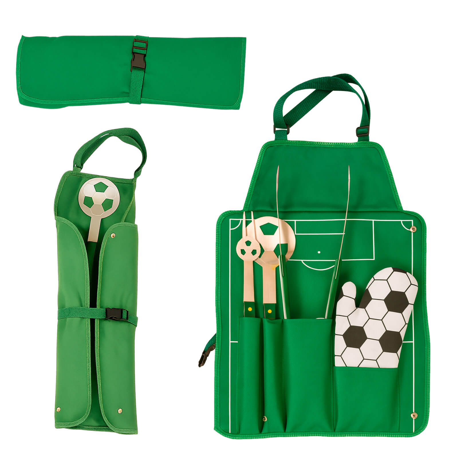 Set de BBQ en estuche con diseño de cancha de fútbol que también funciona como mandil. Incluye guante, pinzas, tenedor asador y volteador.