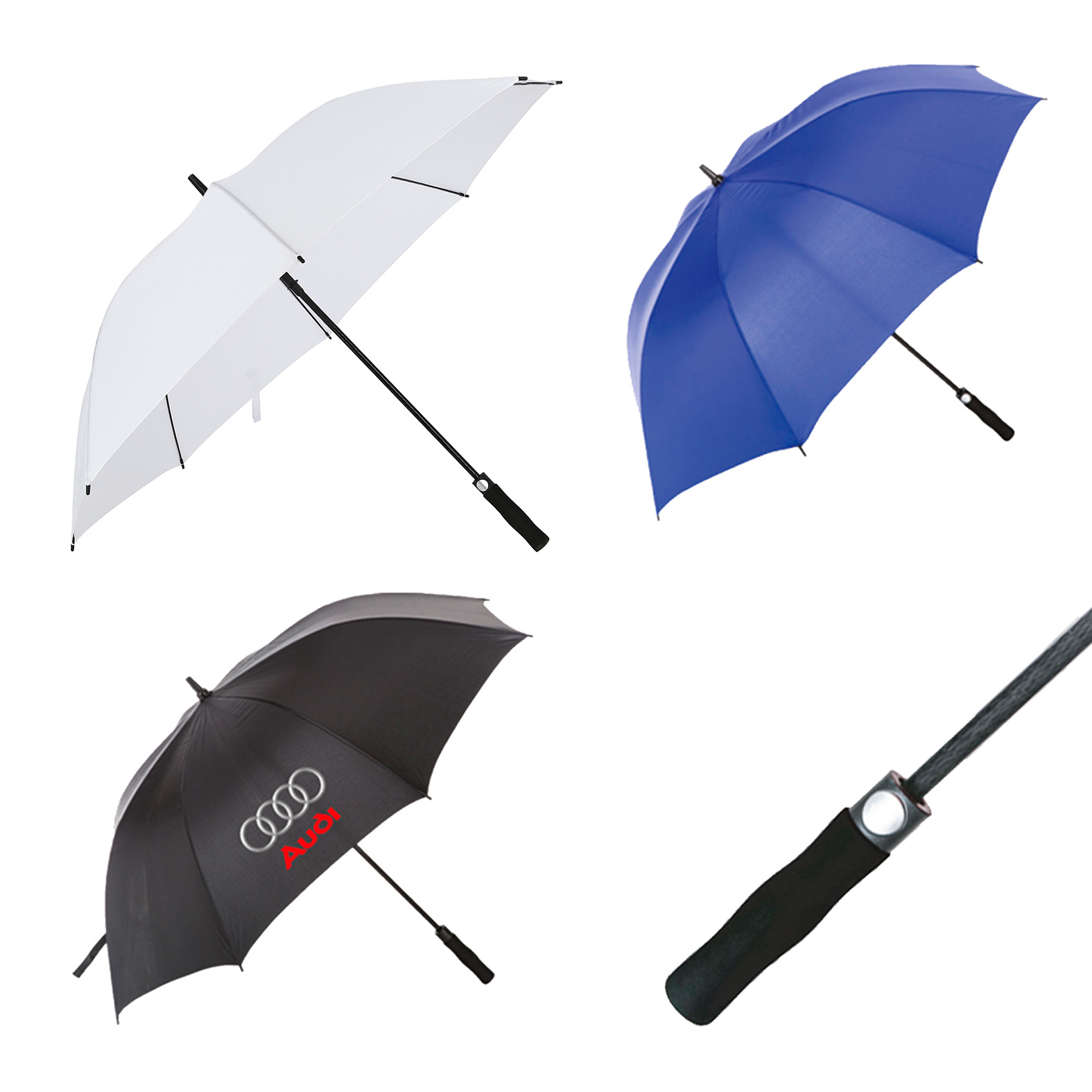 Paraguas circular pongee con sistema de apertura automático, 8 gajos, varillas reforzadas, eje central de fibra de carbono y mango de EVA. Incluye funda con agarradera.