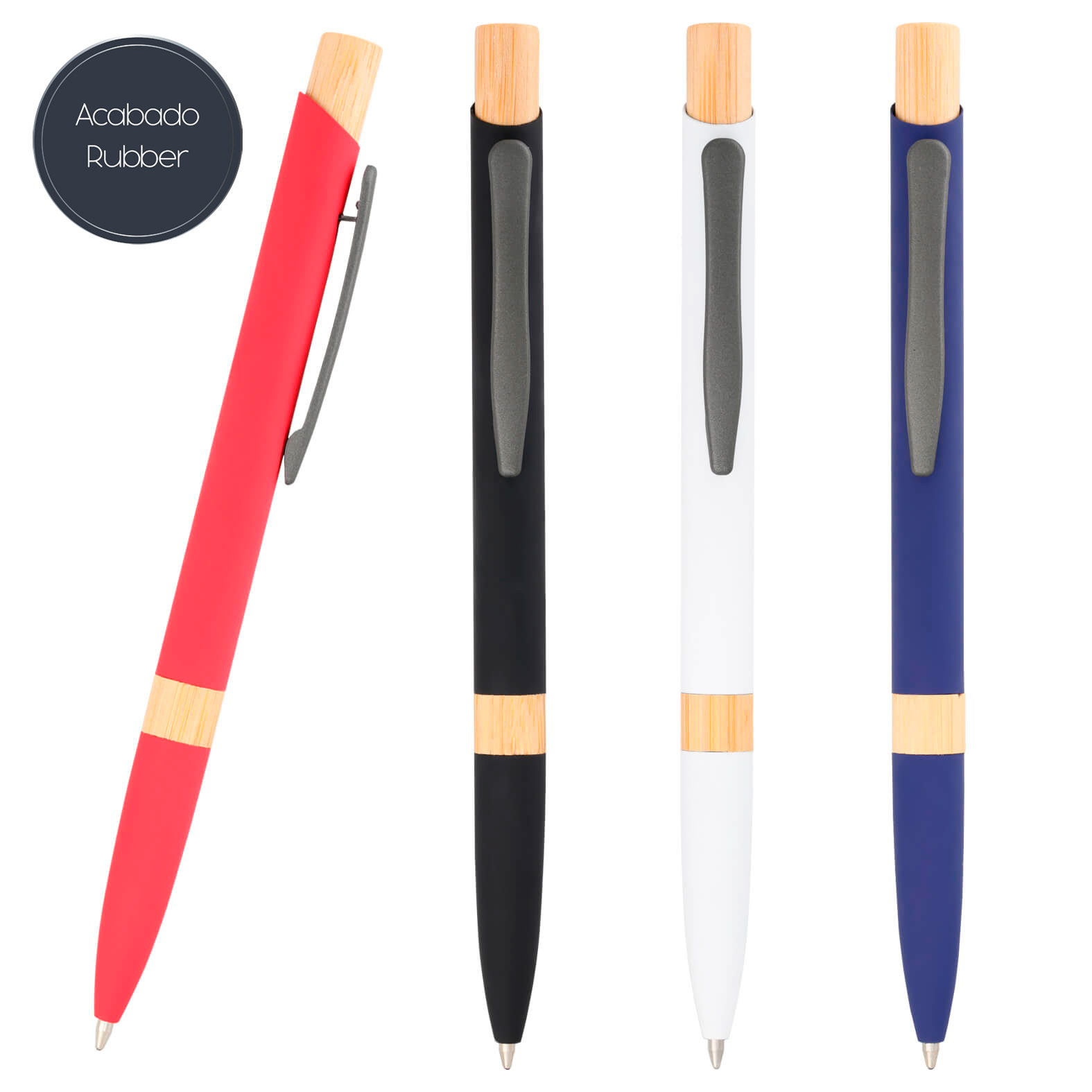 Bolígrafo metálico con acabado rubber, detalle en bambú, clip y mecanismo de click.