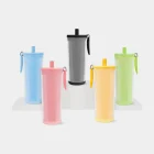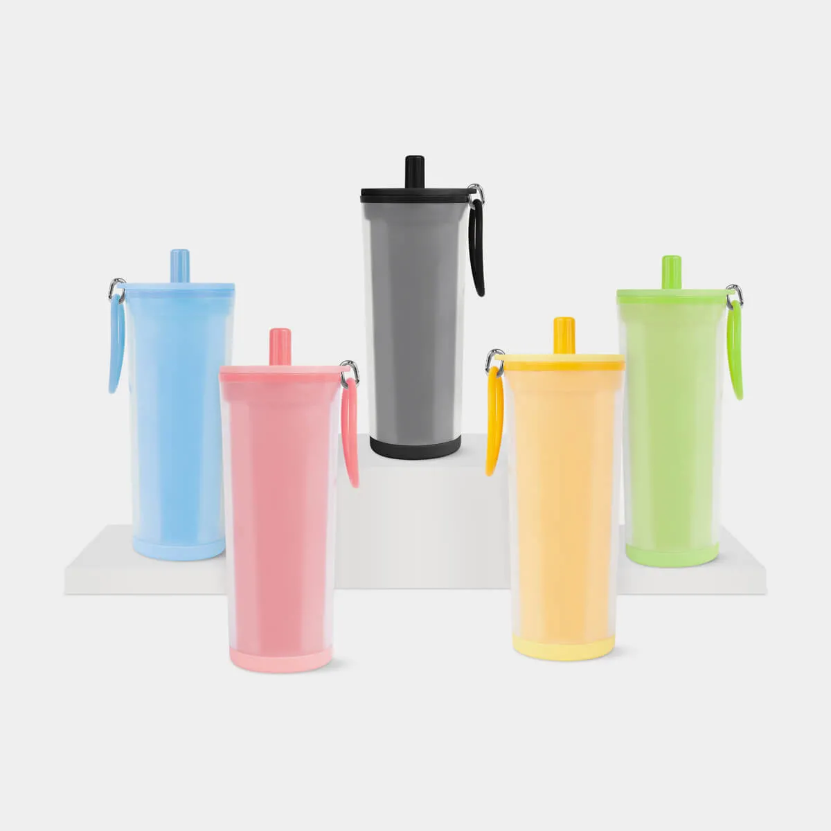 Vaso de plástico de doble pared. Pared interna de plástico a color y externa de plástico transparente. Tapa con cierre de rosca. Incluye popote y asa con forma de aro. Capacidad 16 Oz. Incluye caja individual.