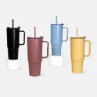 Doble pared. Pared interna y externa de plástico. Tapa de plástico con cierre de push. Sobretapa de silicón con ranura especial para popote. Incluye popote y caja individual.