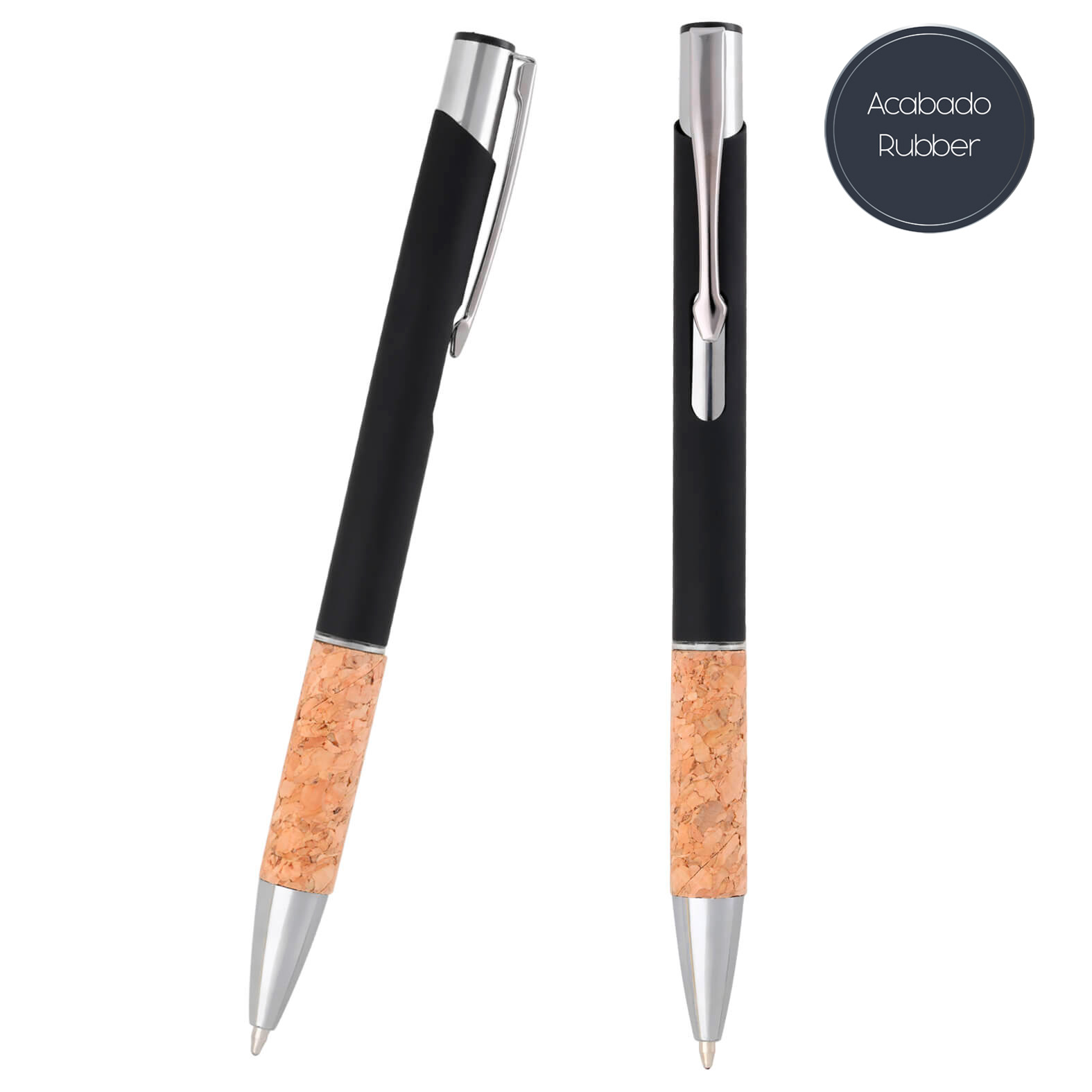 Bolígrafo con acabado rubber, grip de corcho y mecanismo de click.
