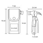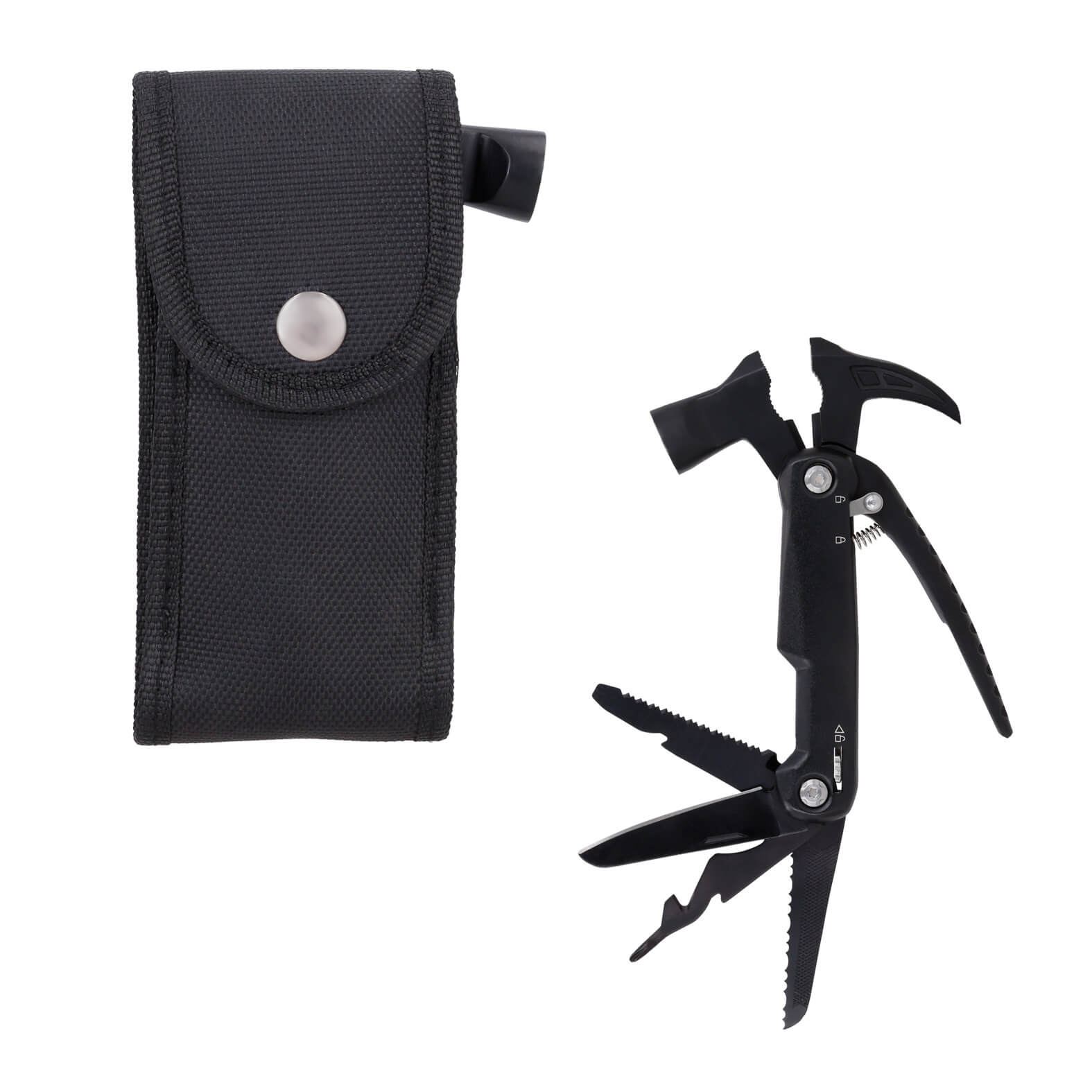 Martillo multiusos que contiene: pinzas, navaja, 2 sierras y 1 destapador con destornillador. Incluye funda.