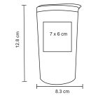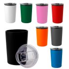 Termo de doble pared con exterior de acero inoxidable e interior de plástico, con tapa de cierre a presión y seguro deslizable.