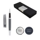 Bolígrafo metálico con acabado rubber y con tapa. Incluye estuche.