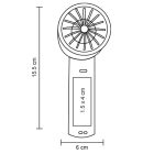 Ventilador portátil con mango de plástico y diseño minimalista. Cuenta con botón de encendido/apagado, 3 velocidades y puerto de carga tipo C.