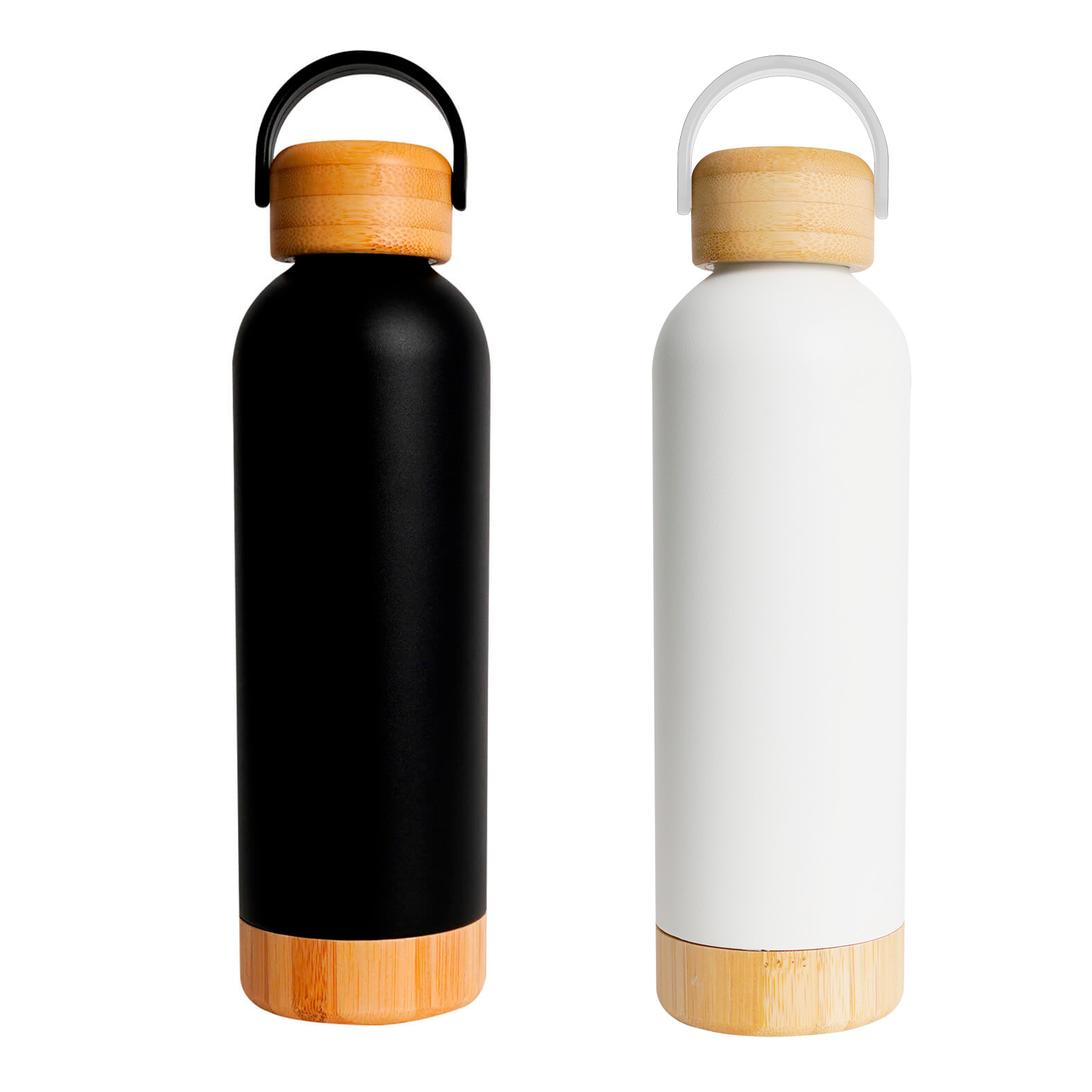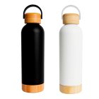 Terrmo con doble pared de acero inoxidable con acabado rugoso, base y tapa enroscable de bambú con asa.