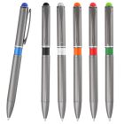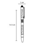 Bolígrafo metálico con detalle en el centro, clip, goma touch screen y mecanismo de click.
